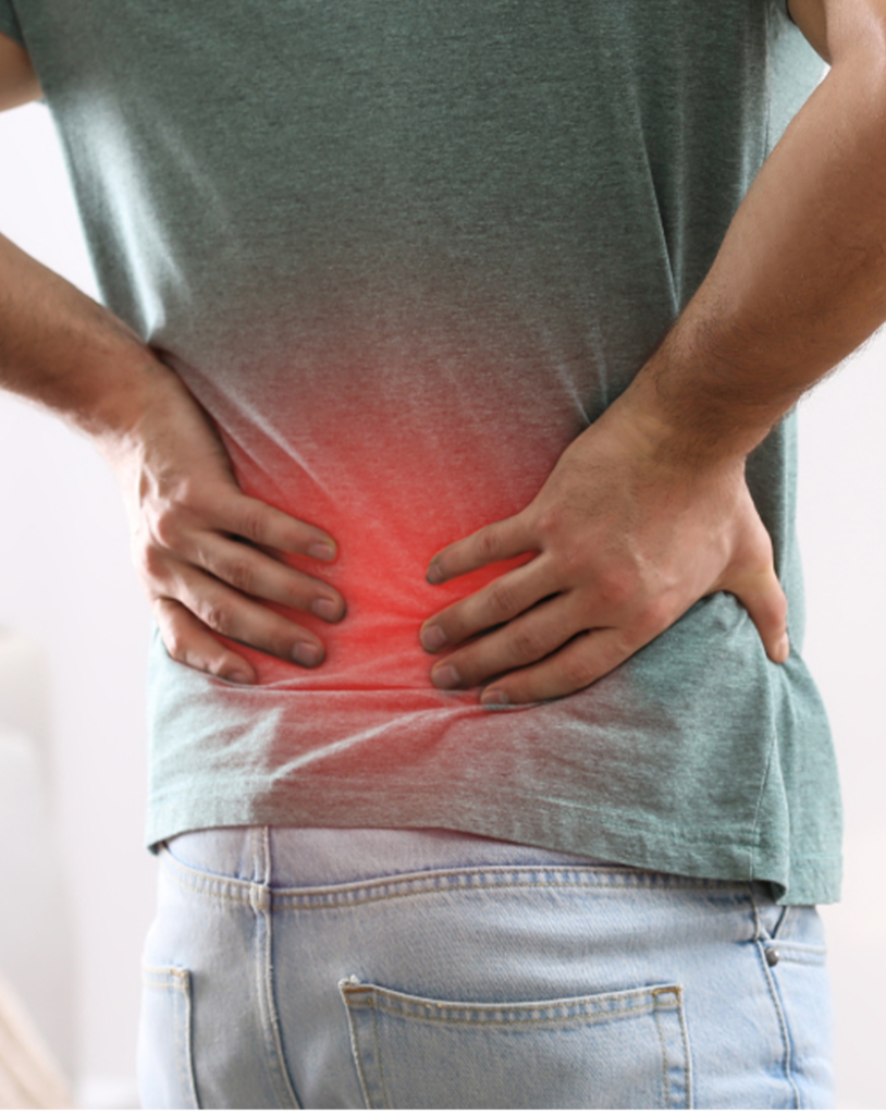 Morning stiffness, struggle after sitting for long, painful bending, lack of strength in lower back.
