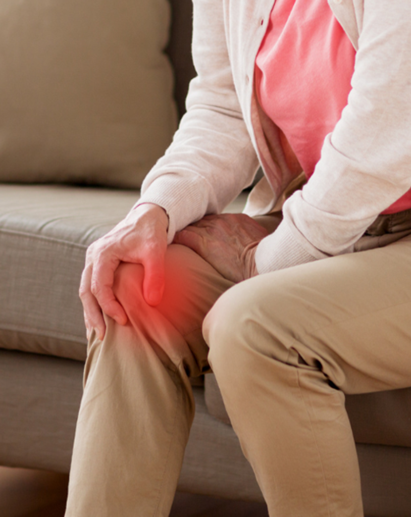 Knee joint inflammation with redness and swelling, weakened legs, limited ability to walk or stand for long, and cartilage degeneration.